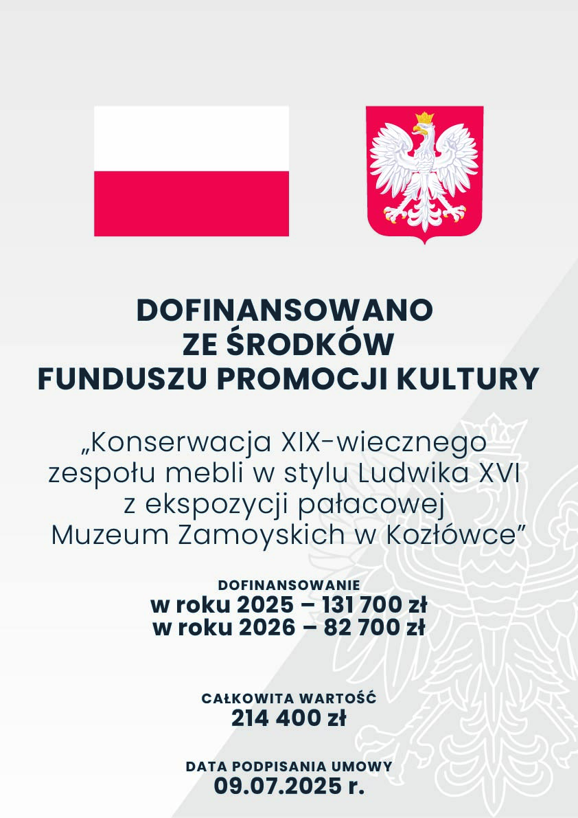 Dwuletni projekt przewiduje renowację 16 muzealnych obiektów: kanap, foteli i  krzeseł. Meble, w eleganckim stylu Ludwika XVI, stanowiły część kolekcji zgromadzonej przez Konstantego Zamoyskiego, I ordynata kozłowieckiego, i są świadectwem jego gustu artystycznego oraz programu ideowego. Po przeprowadzonych zabiegach konserwatorskich meble, zgodnie ze swoim pierwotnym przeznaczeniem, będą nadal eksponowane w salonach kozłowieckiego pałacu.