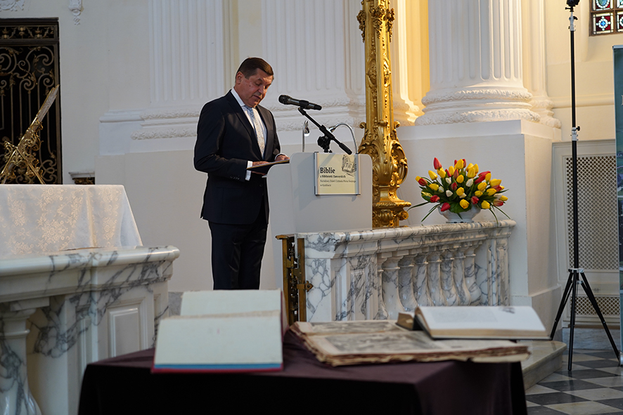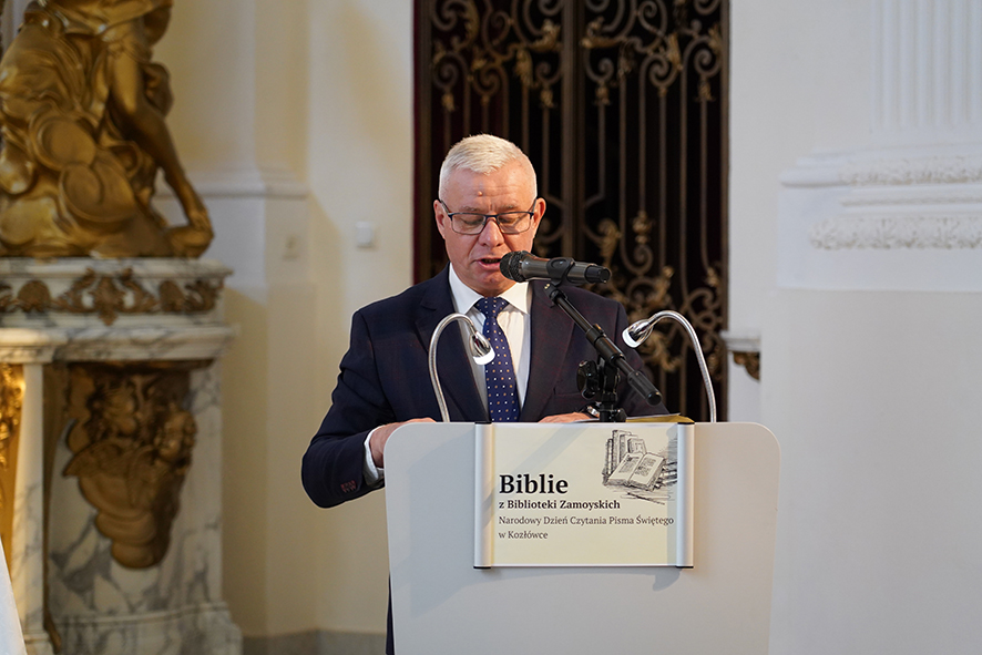 Rozpoczynając wydarzenie Andrzej Pruszkowski Dyrektor Muzeum Zamoyskich stwierdził: „spotykamy się w otwierającym Tydzień Biblijny Narodowym Dniu Czytania Pisma Świętego w miejscu niezwykłym. Jest nim wybudowana przez pierwszego ordynata kozłowieckiego Konstantego Zamoyskiego na wzór słynnej kaplicy wersalskiej kaplica pod wezwaniem Zwiastowania Najświętszej Marii Pannie. Jesteśmy w miejscu modlitwy wielu osób bardzo znaczących dla naszej historii, w tym – ukrywającego się tutaj podczas niemieckiej okupacji – późniejszego Prymasa Tysiąclecia. Ród Zamoyskich, herbu Jelita, których godło herbowe znajdujemy na przepięknych witrażach kaplicy, tak owe trzy skrzyżowane włócznie interpretował: „Niech Ci te trzy kopie przypominają potrójny cel życia: w rodzinie, Ojczyźnie, Kościele; potrójną walkę z sobkowstwem, zwątpieniem, niewiarą, potrójną nagrodę jeśli wytrwasz: miłość rodziny, szacunek narodu, błogosławieństwo Kościoła. Do każdej walki wypróbowanych tych kopii używaj, a choć zraniony zostaniesz, to mniej boli niż odstępstwo, niż grzech, jedyne prawdziwe nieszczęście od czego Boże uchowaj”. Jakże to aktualne wezwanie. W swej pałacowej bibliotece Zamoyscy zgromadzili ok. 10 000 woluminów z różnych dziedzin i okresów, napisanych w 14 językach. Wśród nich do najważniejszych zaliczamy kilkanaście wydań Biblii. Nie są one – niestety – na co dzień dostępne dla zwiedzających. Naszym celem jest udostępnienie w możliwie jak największym zakresie zasobów biblioteki czytelnikom w internecie.”