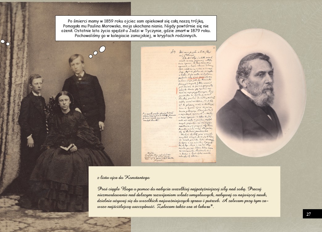 Na planszy w sepiowej tonacji widoczna jest kompozycja z kilku elementów. Po lewej stronie znajduje się stare, czarno-białe zdjęcie rodzinne. Na fotografii siedzi dziewczyna w ciemnej, długiej sukni z wysokim kołnierzem. Ma poważny wyraz twarzy i gładko uczesane, ciemne włosy przedzielone na środku. Po jej bokach stoją dwaj chłopcy w ciemnych, eleganckich ubraniach. Młodszy stoi po lewej stronie, starszy – wyższy – po prawej. Wszyscy troje patrzą w obiektyw. Tło stanowi jasna kotara studyjna. Nad głowami postaci umieszczono graficzny dymek z tekstem wspomnieniowym. W centralnej części planszy pokazano pionową kartę rękopisu – pożółkłą kartkę zapisaną gęstym, odręcznym pismem. Widać poprawki i podkreślenia czerwonym kolorem. Po prawej stronie znajduje się owalny portret mężczyzny z siwą brodą i wąsami. Ujęty jest z profilu, zwrócony lekko w lewo. Ma krótkie, starannie uczesane włosy i poważny, skupiony wyraz twarzy. Ubrany jest w ciemny surdut i jasną koszulę. Tło portretu jest jasne i jednolite.Na dole planszy umieszczono jasny prostokąt z cytatem zapisanym ozdobnym pismem. W prawym dolnym rogu widnieje numer strony: 27.