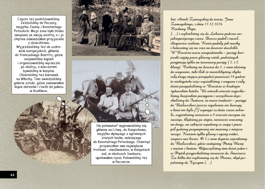 Plansza utrzymana jest w stonowanej, beżowo-oliwkowej kolorystyce i ma charakter historycznej prezentacji. Po lewej stronie znajduje się jasne pole z długim tekstem wspomnieniowym. Czarną czcionką opisano rodzinne podróże do Peczary, Biarritz i Włoch, wizyty w galeriach sztuki oraz wyjazdy do europejskich uzdrowisk.W górnej części, na środku, widoczna jest czarno-biała fotografia grupowa wykonana w plenerze. Kilkanaście osób – kobiety w długich sukniach i kapeluszach oraz mężczyźni w garniturach – siedzi i stoi na schodach ogrodowych. Postacie ustawione są w kilku rzędach. W tle widać gęste krzewy i drzewa. Wszyscy patrzą w stronę obiektywu. Poniżej umieszczono kolejne czarno-białe zdjęcie. Przedstawia kilku mężczyzn w jasnych strojach i kapeluszach, siedzących blisko siebie na łodzi. Trzymają długą broń myśliwską. Patrzą w obiektyw, niektórzy lekko się uśmiechają. W lewym dolnym rogu znajduje się owalna fotografia myśliwska. Kilku mężczyzn w kapeluszach pozuje w lesie przy upolowanym zwierzęciu. Siedzą i stoją na powalonym pniu drzewa. Ubrani są w ciemne stroje, część z nich trzyma broń. Wokół widoczne są nagie gałęzie drzew, co sugeruje chłodniejszą porę roku. Między zdjęciami umieszczono krótką notatkę dotyczącą polowań na Litwie i w Karpatach. Po prawej stronie planszy znajduje się duży, jasny prostokąt z ręcznie zapisanym listem. Pismo jest pochylone, eleganckie, a tekst gęsto wypełnia całą stronę. Na górze widnieje nagłówek z datą: 11 grudnia 1876 roku. List opisuje podróż w trudnych, zimowych warunkach. W lewym dolnym rogu planszy widnieje numer strony: 44. Całość tworzy spójną, archiwalną kompozycję poświęconą podróżom i polowaniom w XIX wieku.